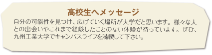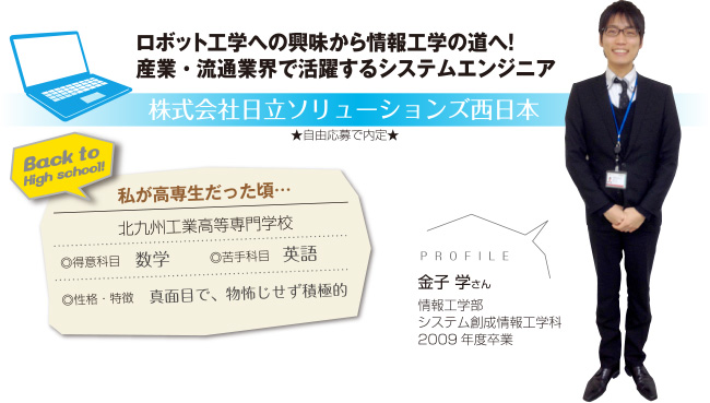 まず、転勤が少なく、できるだけ地元で働けることを最優先で考えました。実は偶然にも、今の会社の面接の際に受けた質問が、九工大の入試の面接で受けた質問ととてもよく似ていました。大学と企業が求めているものにつながりがあることを実感し、自信を持って応えることができました。また、物怖じしない性格と、面接で自分の意見をはっきりと伝えられたことが、採用につながったのではないかと思います。