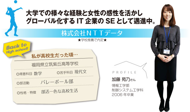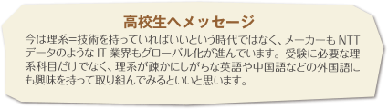 NTTデータには、男女平等に活躍できる場がたくさんあり、男女それぞれの家庭と仕事の両立を支援する制度が整っていることと、家族の理解があったので、結婚を機に仕事を辞めようとは思いませんでした。これまでSE(システムエンジニア)といえば男性というイメージが強かったかもしれませんが、これからは男性にはない女性らしい視点でシステムの提案をしたり、システム開発をしていくことが重要だと思います。