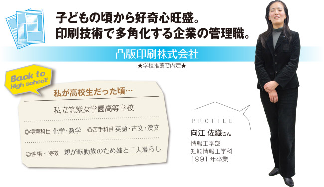 研究室の先生には大学院進学を勧められましたが、大学4年当時、既に自分にはソフト開発に向かないという気がしていました。加えて、飽きっぽい私には多角経営の会社がいいと父からアドバイスを受けたこと、現在の会社にOB訪問をして素晴らしくいい印象を受けたことから就職を決めました。