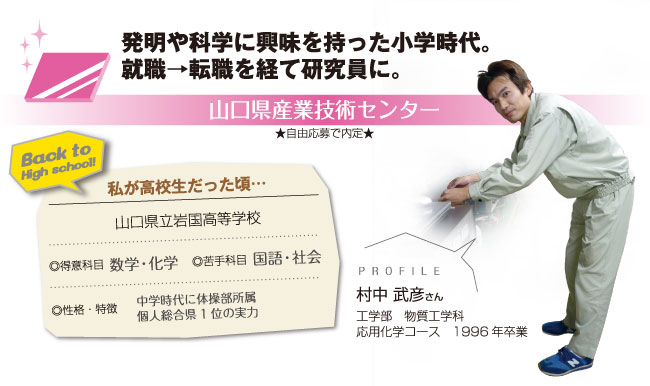 卒業後、いったん電気化学系の中小企業に就職しましたが、夢を諦めきれず現在の職場に転職。山口県産業技術センターは、中小企業支援のための研究施設なので、大学や研究室で培った研究精神はもちろん、中小企業で働いた経験も役立っています。