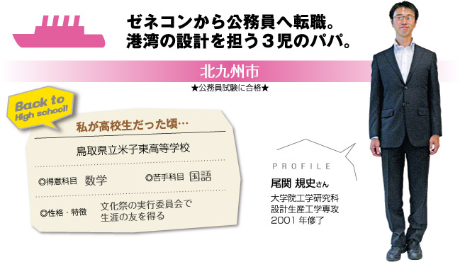 新卒で地図に残る仕事がしたくて、海洋工事が得意なゼネコンに就職しました。工事現場の施行管理をする仕事だったので、現場が変わる度に転勤があったのですが、学生時代海外を飛び回っていたこともあり全く気になりませんでした。しかし、就職4年目に子供が生まれたのをきっかけに、転勤がなく、事業の計画から現場の施行管理まで一連の仕事ができる地方公務員の技術職に転職しました。今は妻と3人の子供との時間を大切にしながら仕事をしています。