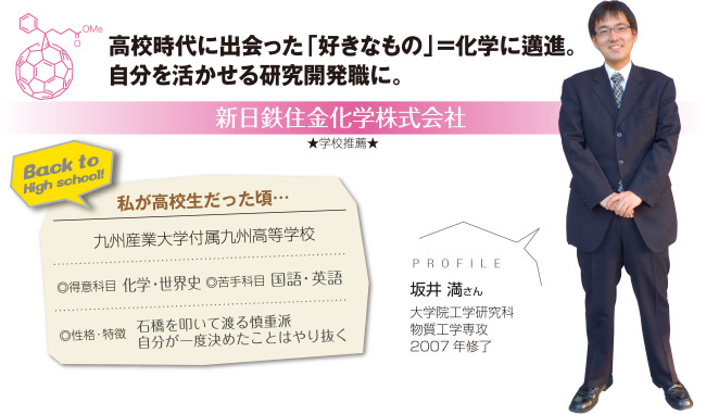 入学当初は友人とドライブに出かけたりしてよく遊んでいましたが、4年生になると研究室に配属になり、研究に明け暮れました。有機合成の研究は自由に何でも作れる「料理」の様なもの。自分の考えでいろいろな物を組み合わせ、立てた仮説を実証できると大きな達成感があります。また、研究室での先生方やメンバーとのコミュニケーションも、研究成果を出すためには欠かせません。色々な面で協力し、時には衝突しながら研究を進めていった体験は、就職してからも大いに役立ちました。