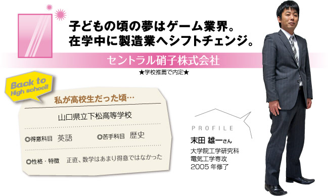 大学時代にプログラムをいやというほどやったので、修士2年次にはものづくりで自分のスキルを活かせる製造業に就きたいと考えるようになりました。地元山口で働きたいと研究室の先生に相談したところ、この会社を紹介していただきました。