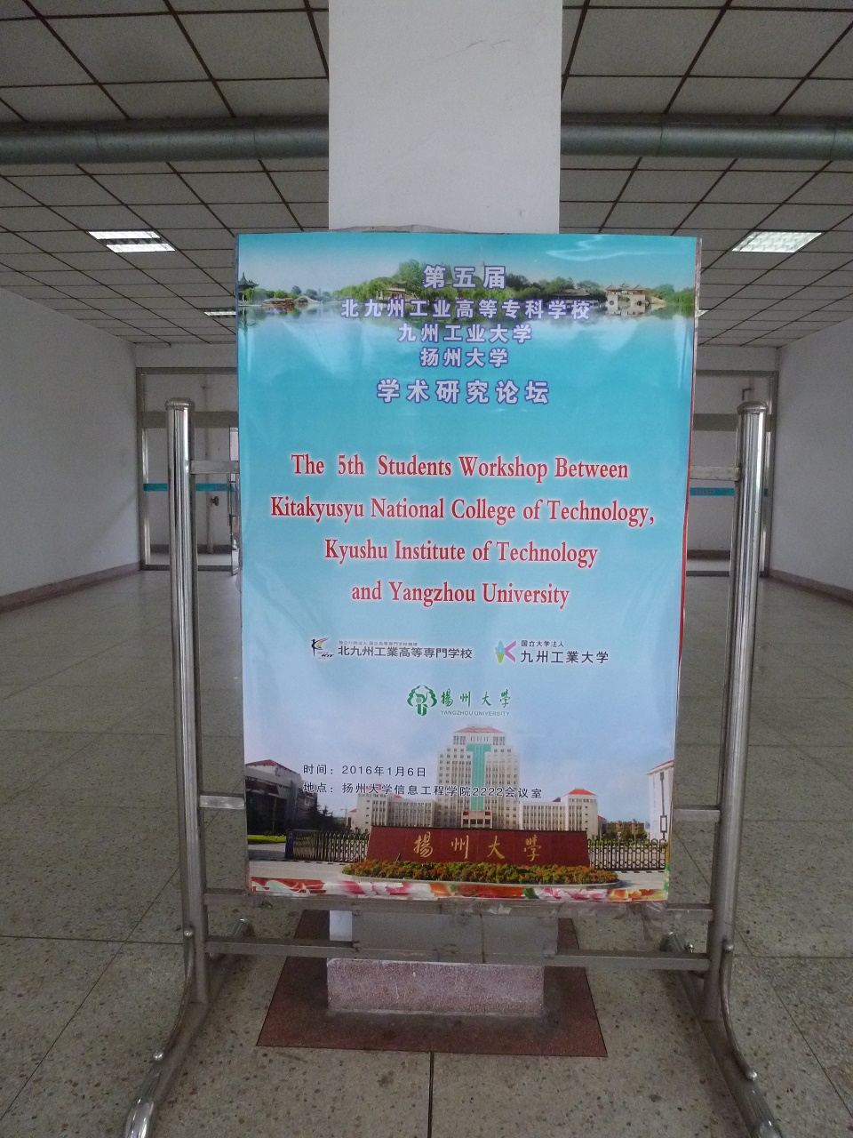平成28年1月 6日(水)、ダブルディグリー締結校の揚州大学(中国)と北九州高専および本学の3校による第5回学生主体合同ワークショップを、揚州大学にて開催しました。このワークショップは日本と中国で1年毎に交代で開催しています。 日本からは本学学生5名、北九州高専学生4名、中国からは揚州大学学生11名が参加し、熱心な発表と学生同士による活発な質疑が行われ、盛会のうちに終わりました。
